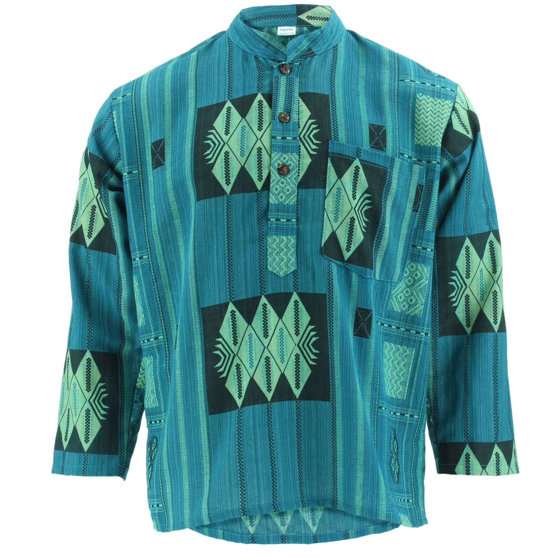 Western style long sleeve kurta grandad shirt made from heavy weight 'Naga' cotton. Featuring a breast pocket and polished coconut buttons.