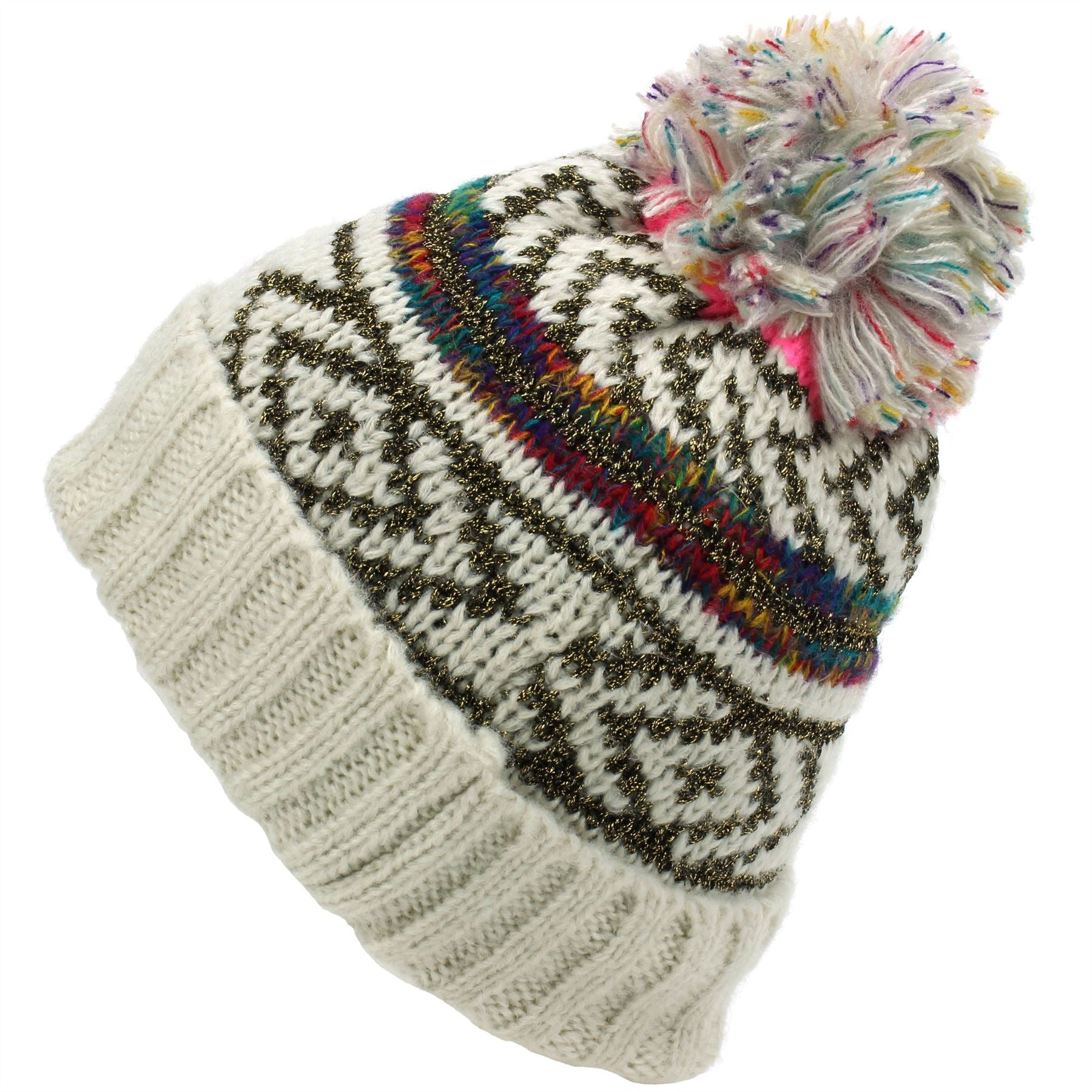 Knitted Beanie hat with a ribbed stitching turn up, multicoloured bobble and glittery Aztec pattern stitching