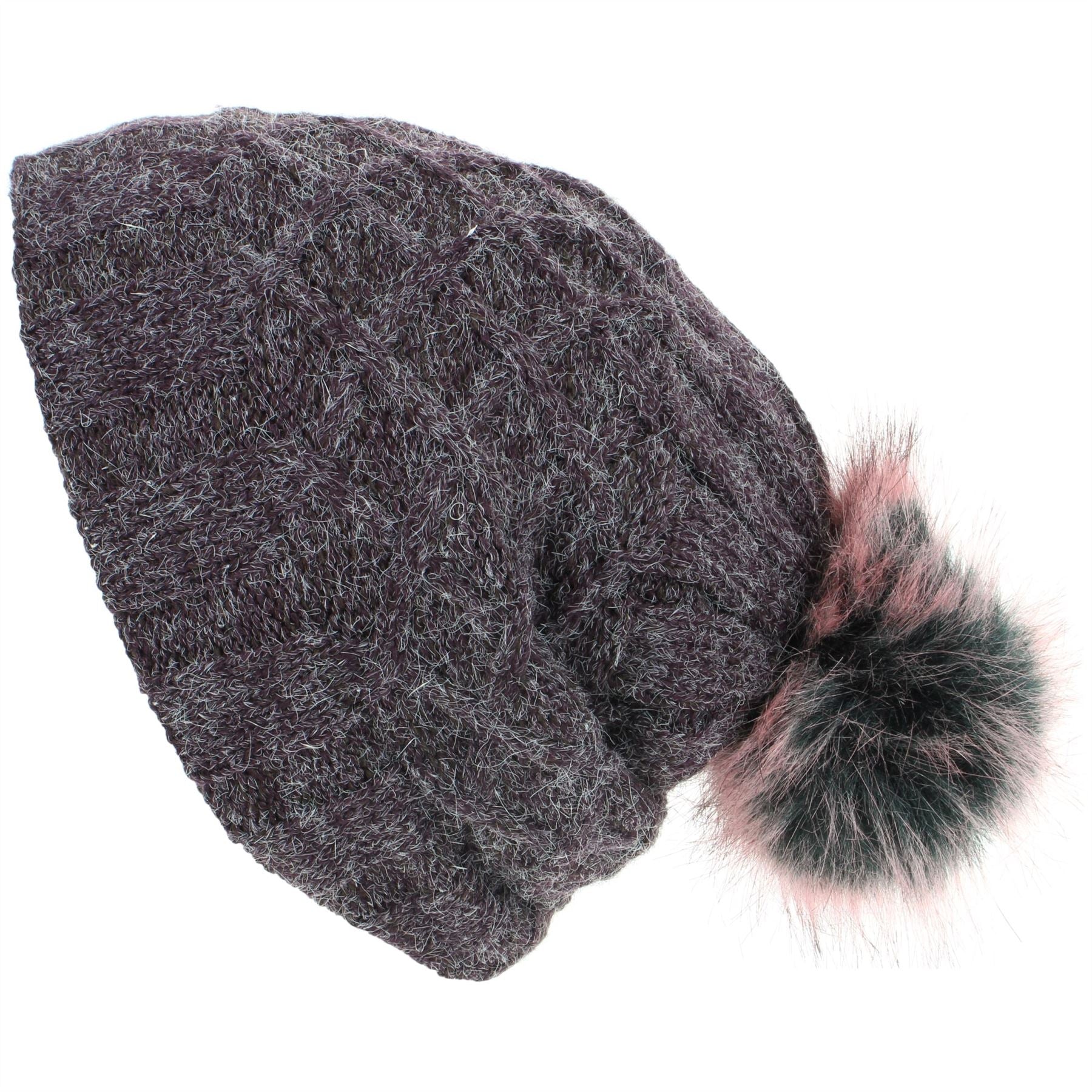 Soft diamond knit slouch beanie hat with a detachable faux fur bobble and a super soft acrylic fleece lining.