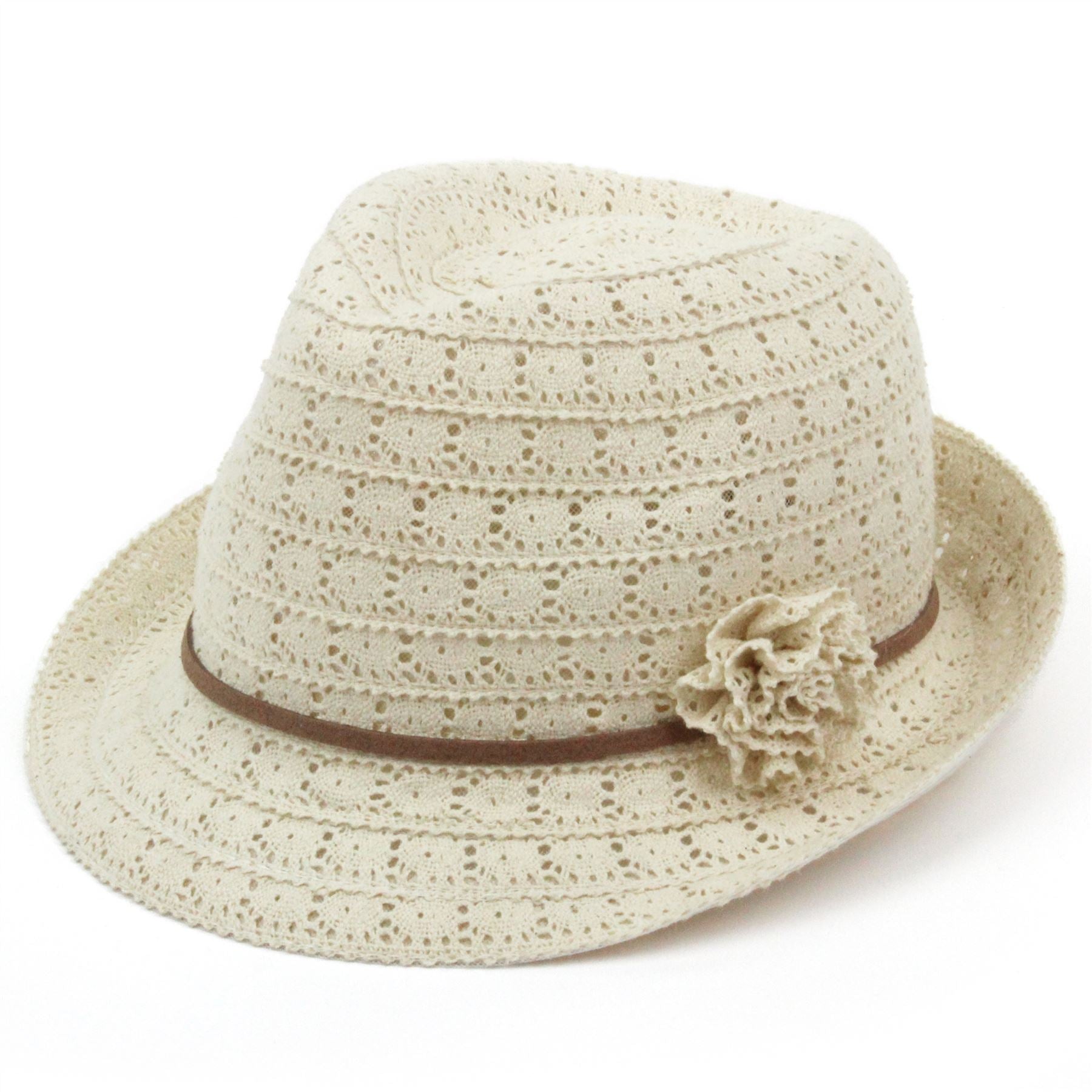 Elegant lace trilby hat with a skinny faux leather band and a lace flower to the side.