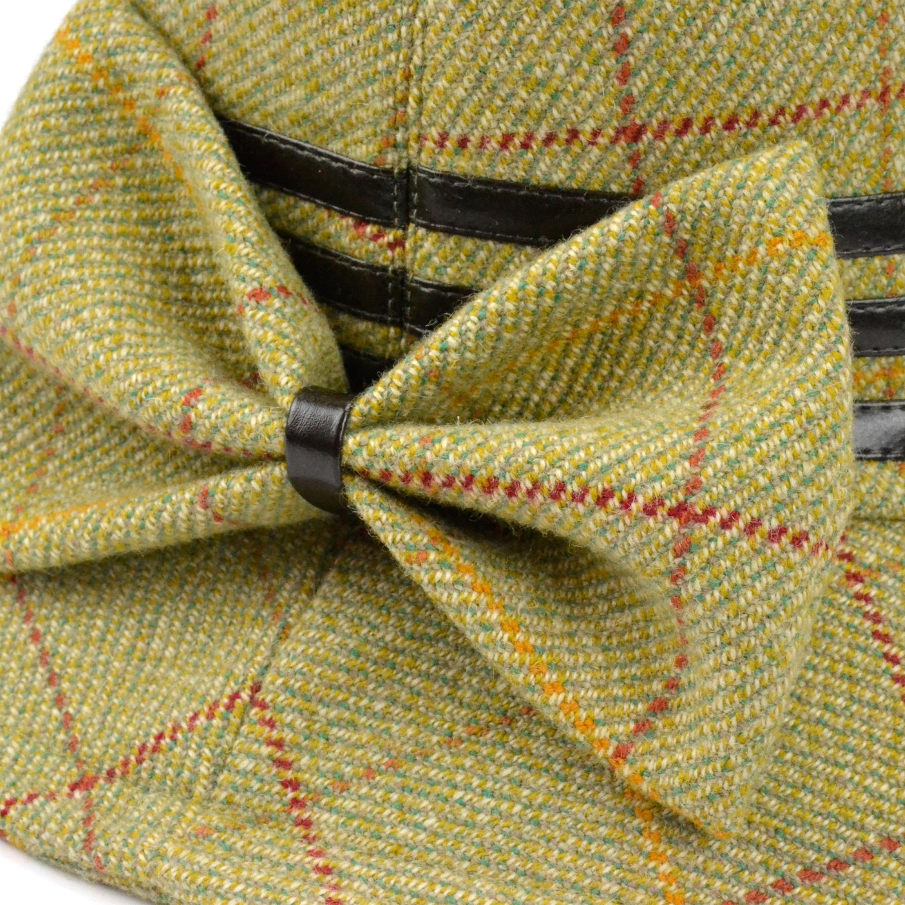 A hardwearing, warm and fully lined ladies wool tweed hat with faux leather bands, tweed bow, soft lining and DuPont Teflon protective coating.