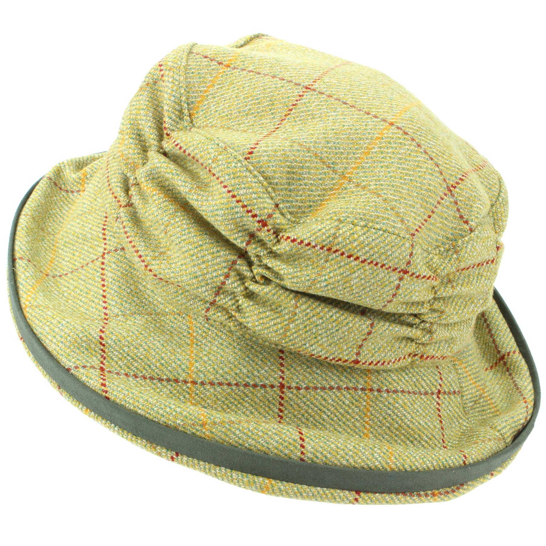 Ladies wool tweed hat with a downward sloping brim, suede trim, flat top, a ruched crown and a DuPont Teflon coating.