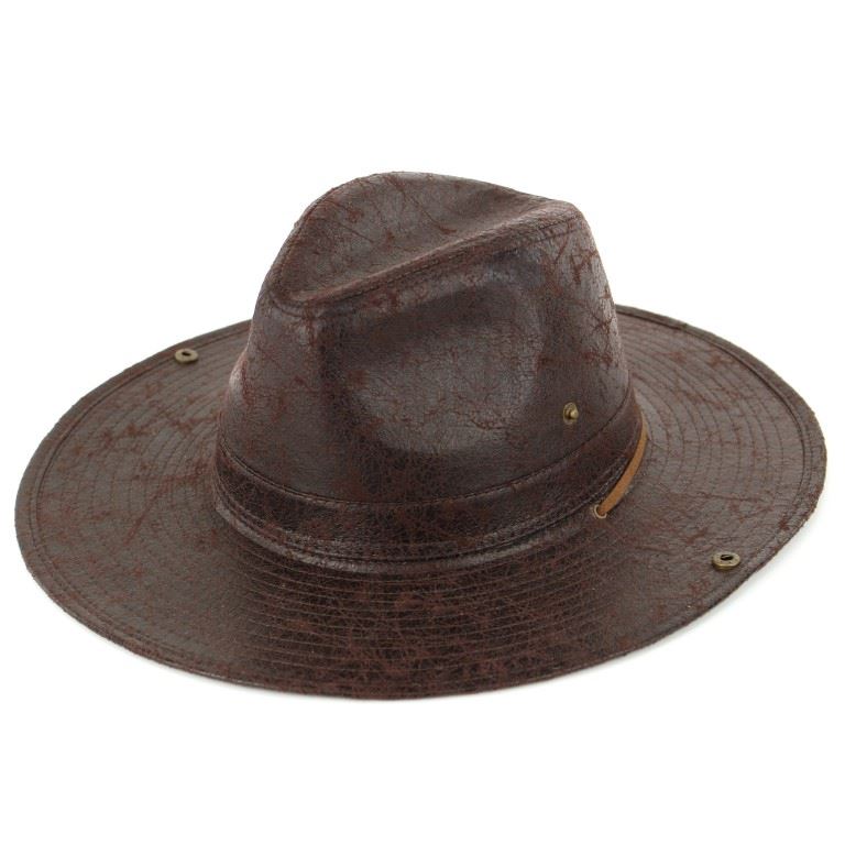 Brown leather effect fedora hat with poppers on either side for fastening the brim up to the crown.