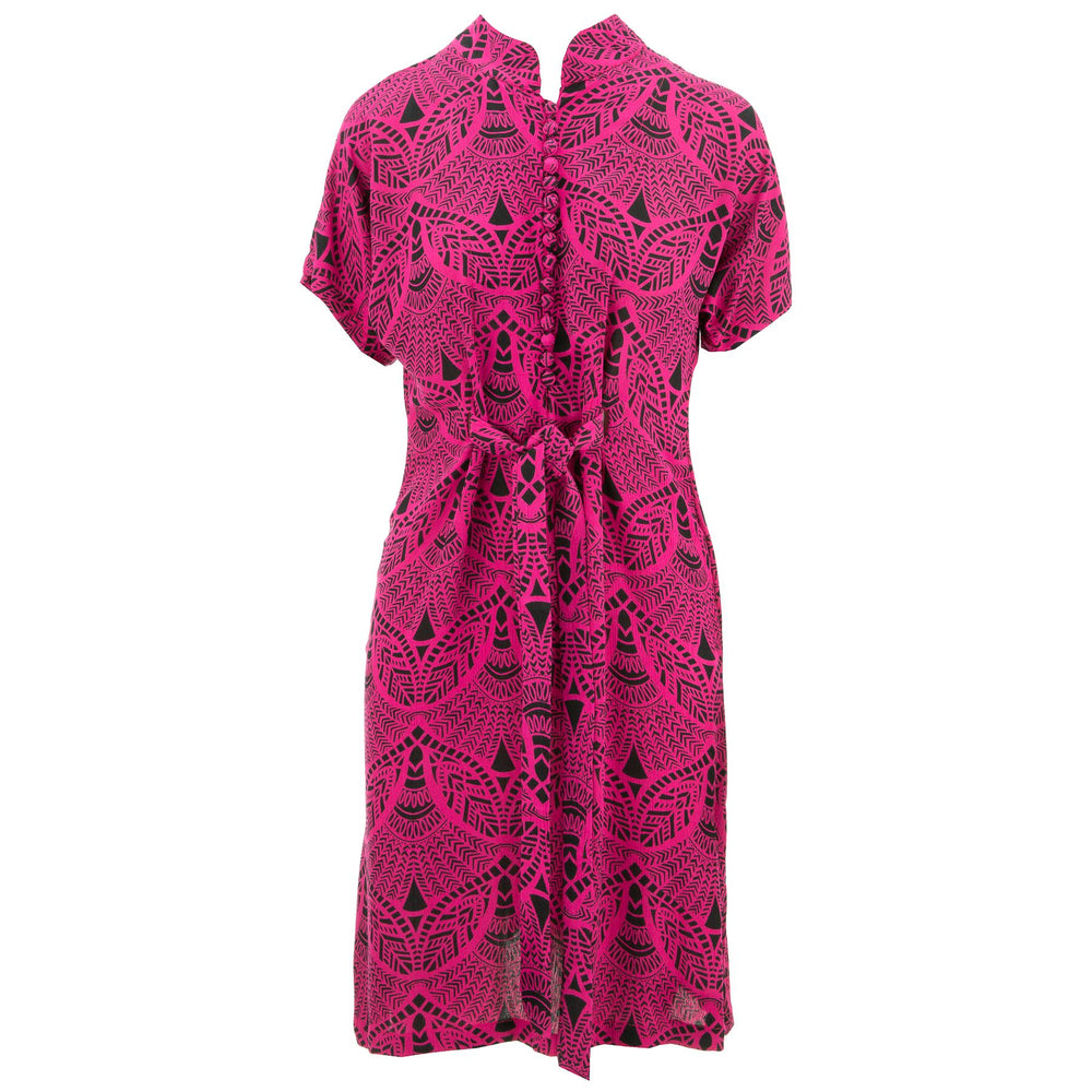 A softprint dress that can be worn to work or a special occasion. With a Mandarin collar and covered buttons with a belt that can be fastened front or back.