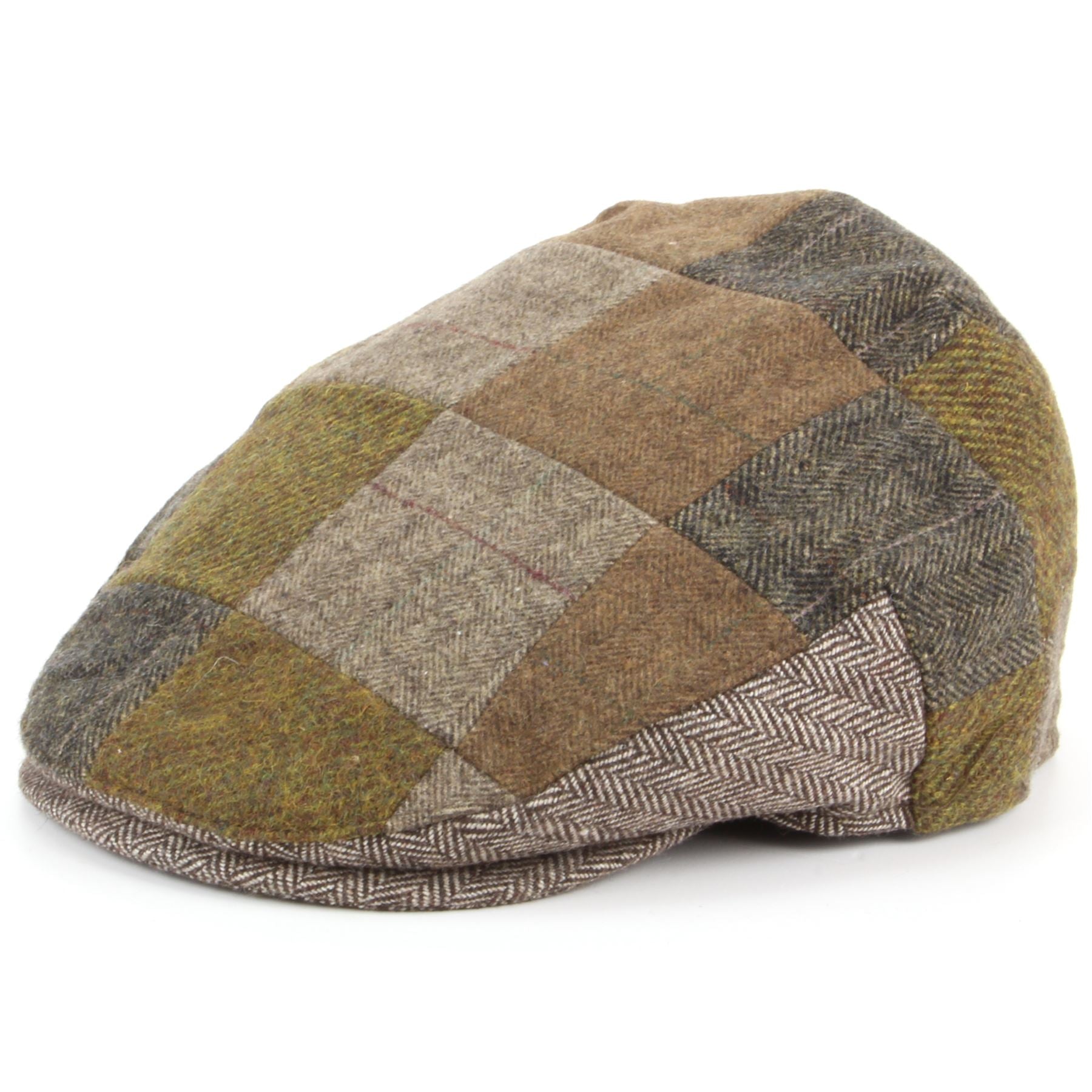 Patchwork wool tweed flat cap with a flat crown and covered peak.