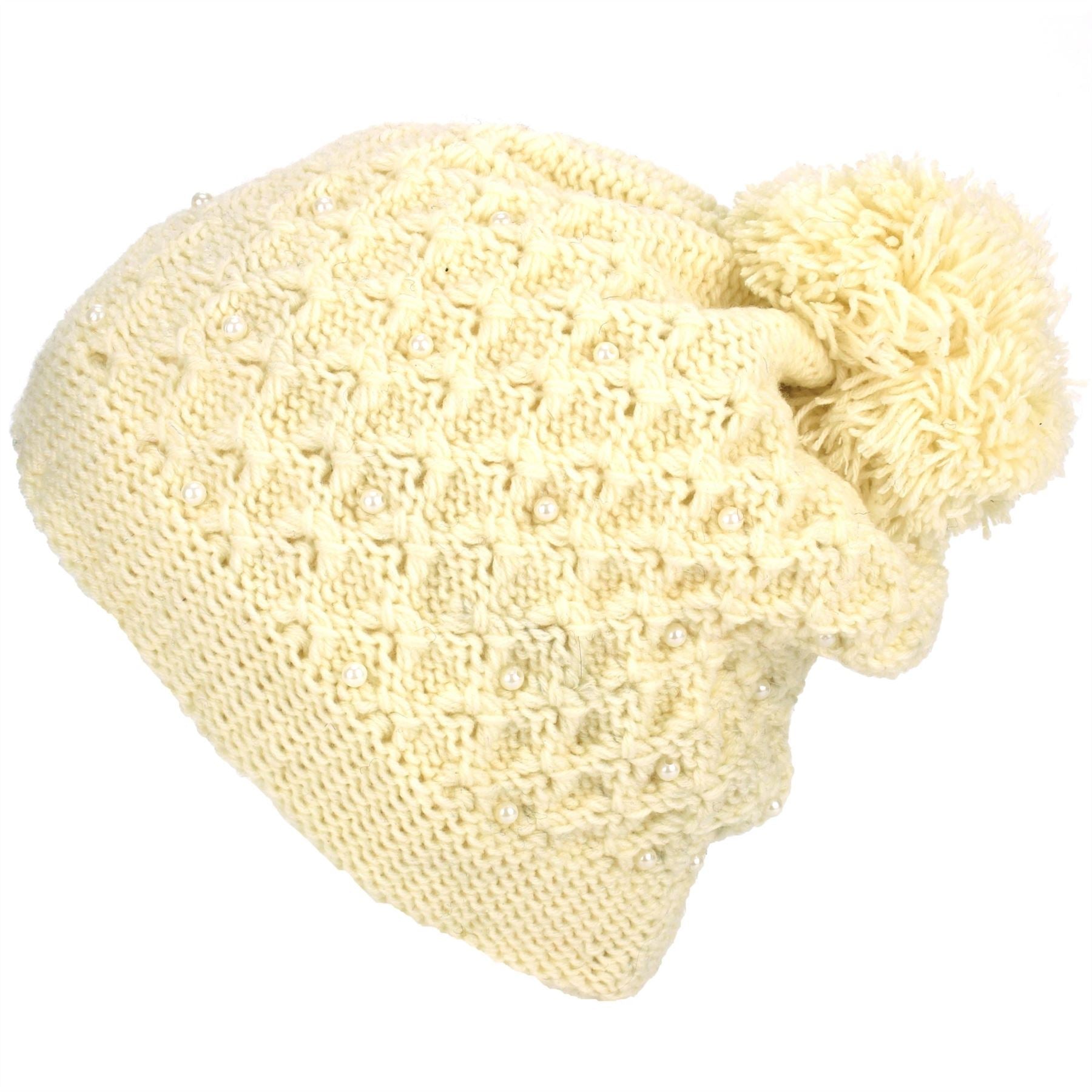 Handmade acrylic pearl lattice beanie hat with a bobble and polyester fleece lined band.