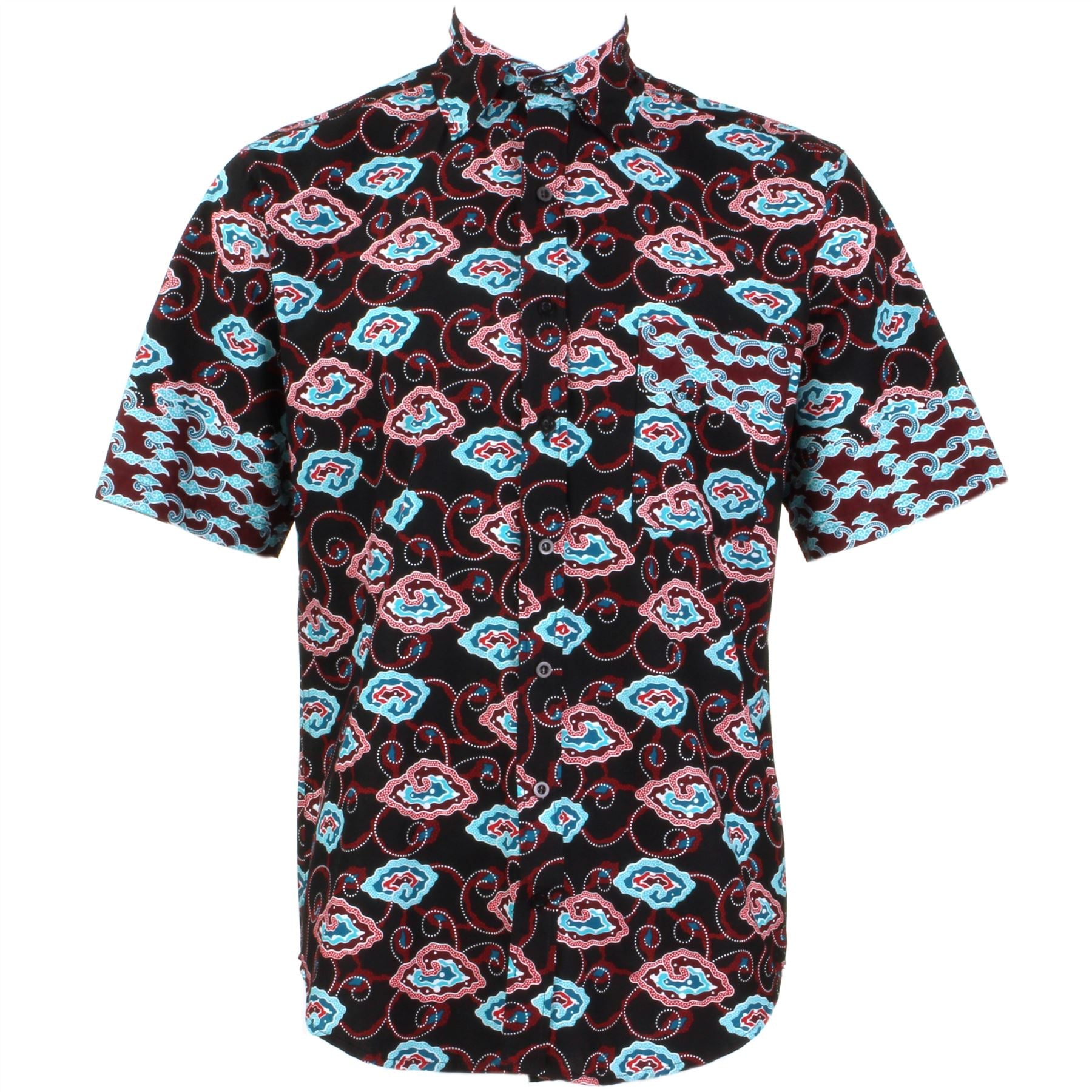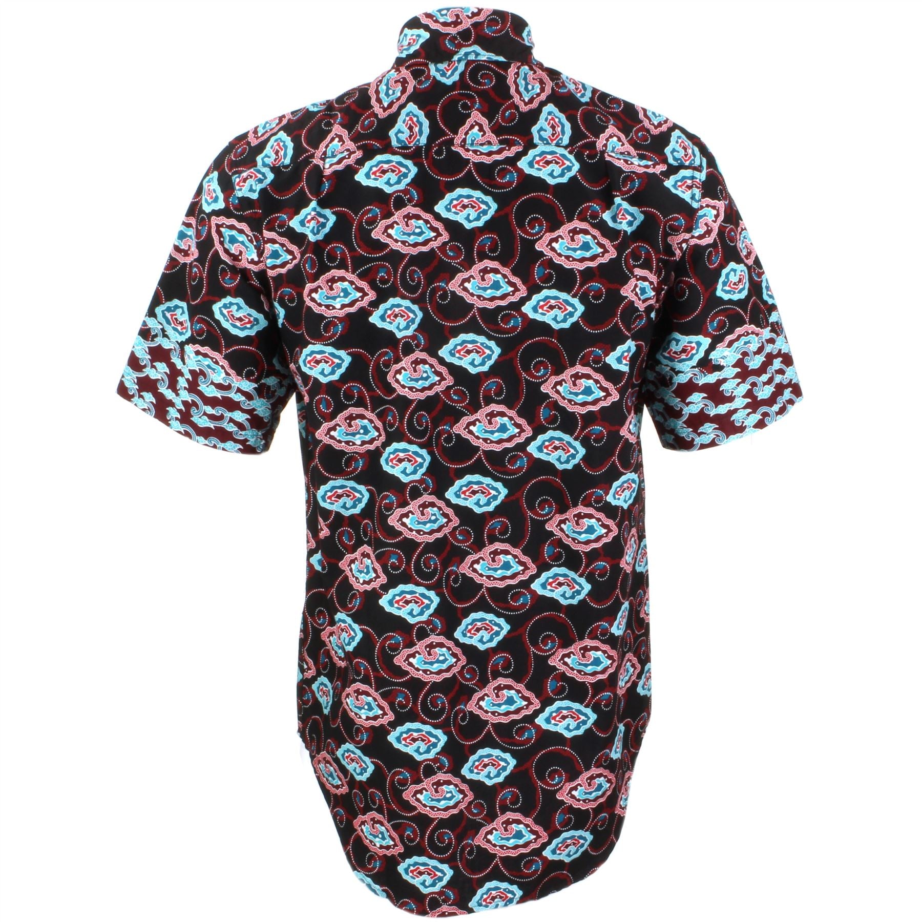 Black, Red & Turquoise Abstract shirt with short sleeves, classic collar, chest pocket and curved hem.