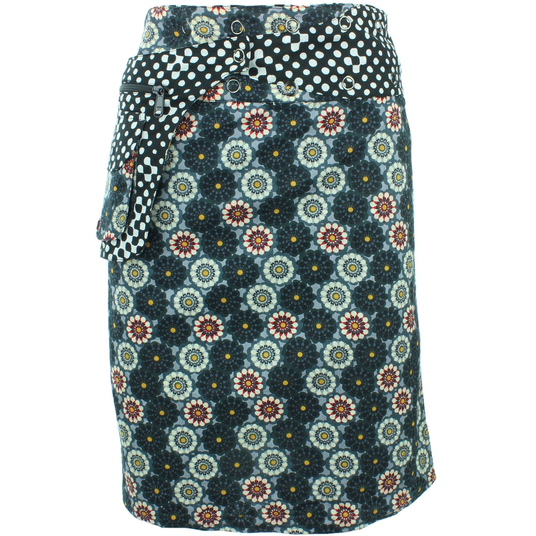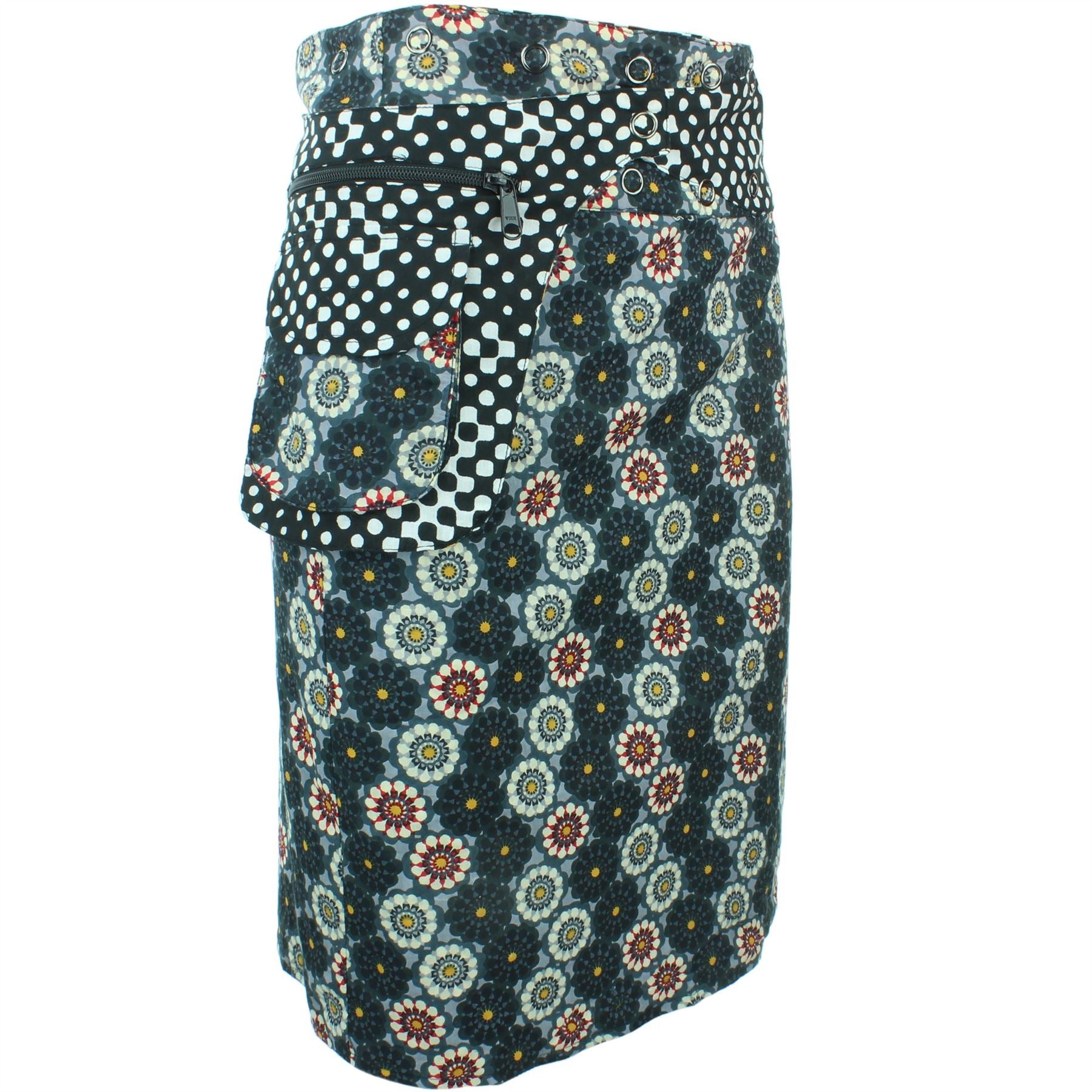Reversible wrap knee length skirt with a double line of poppers round the waist for easy size adjustment. Made from bright, eye catching fabrics and featuring a removeable pocket that can be attached on both sides of the skirt.