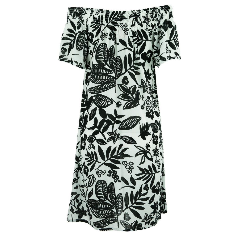 Very comfy dress with a shirred elastic neckline that can be worn on or off-shoulder, short sleeved and loose.