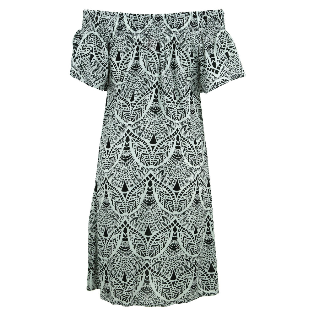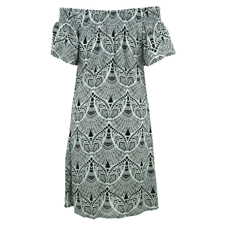 Very comfy dress with a shirred elastic neckline that can be worn on or off-shoulder, short sleeved and loose.