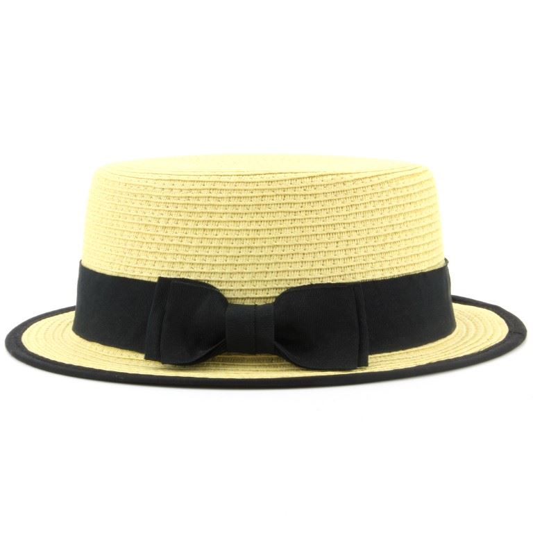 Textured straw style paper boater hat with a short brim, wide contrast black band, trim and large bow.