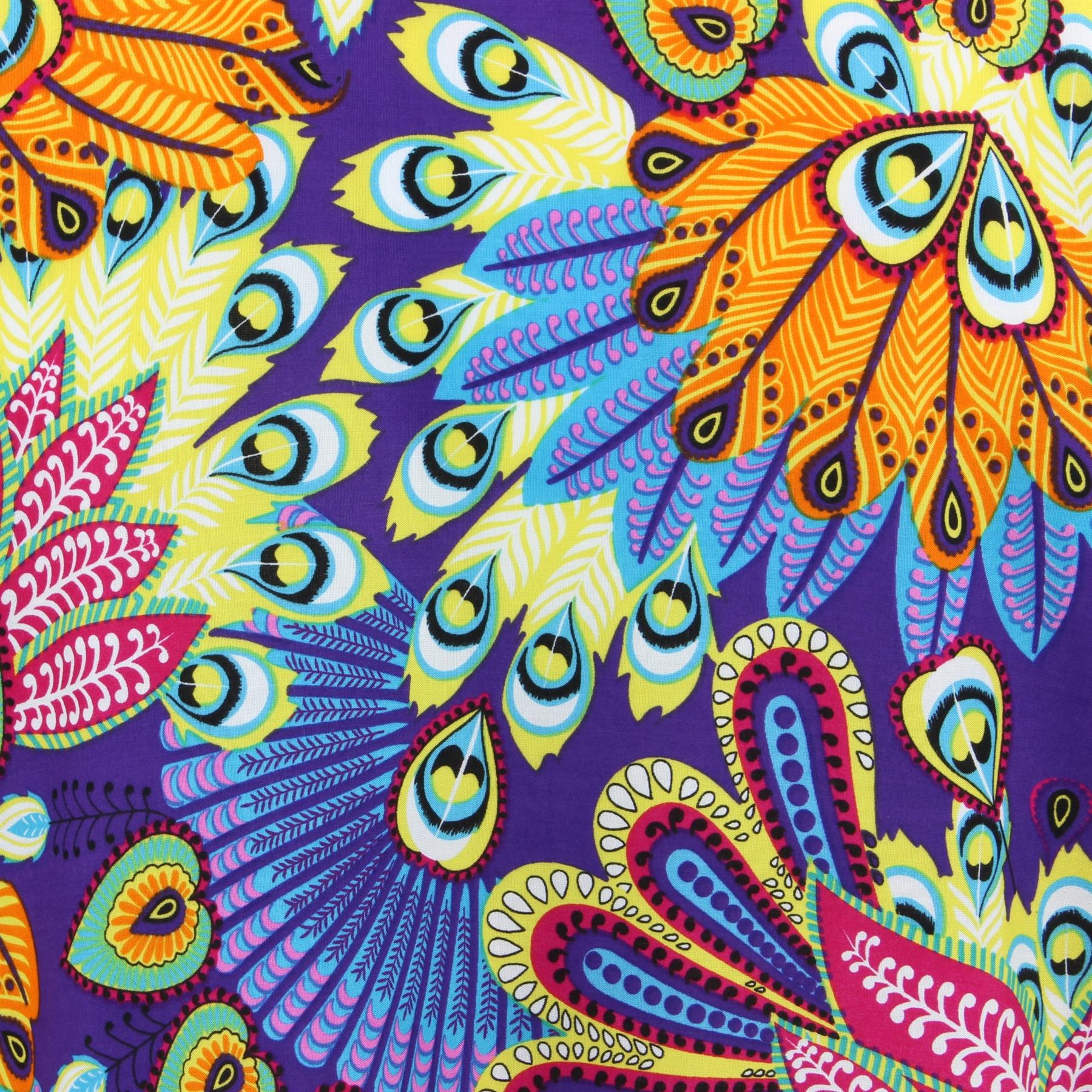 Print: Bright abstract tropical print Hawaiian shirt with a purple background.