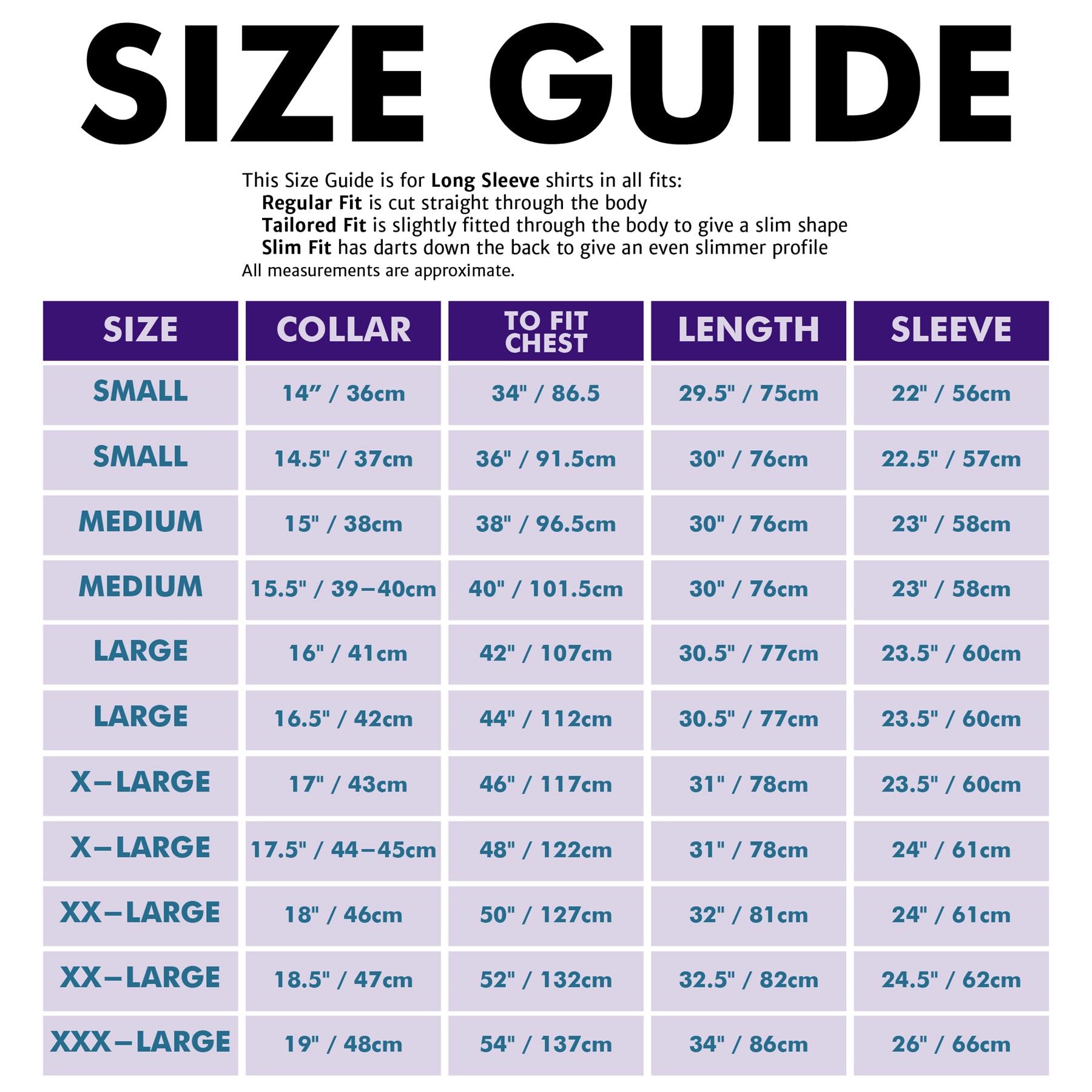 The Size Guide below is for long sleeve shirts in all fits -