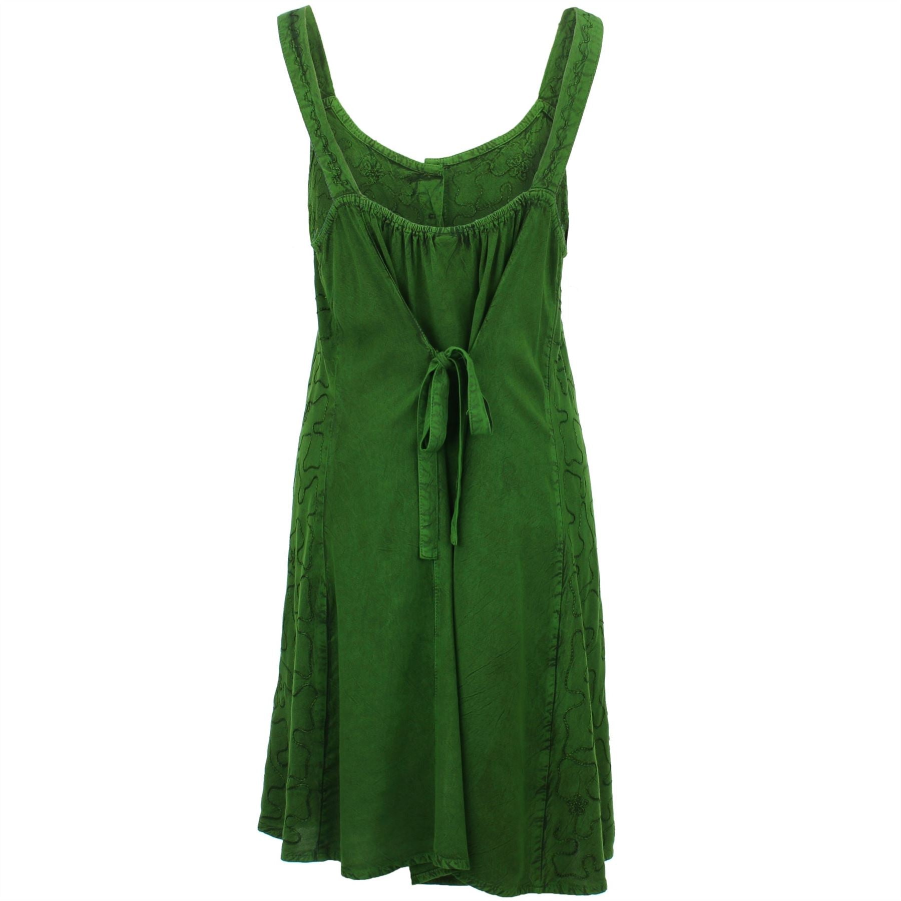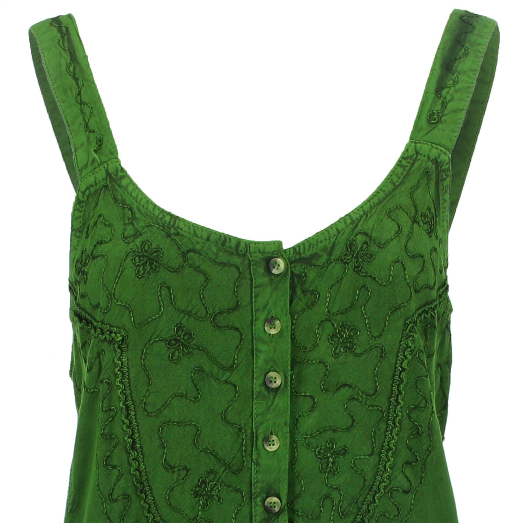 Strappy button down sleeveless dress with an embrided floral pattern on the front, embrided sides, elasticated back and back ties.