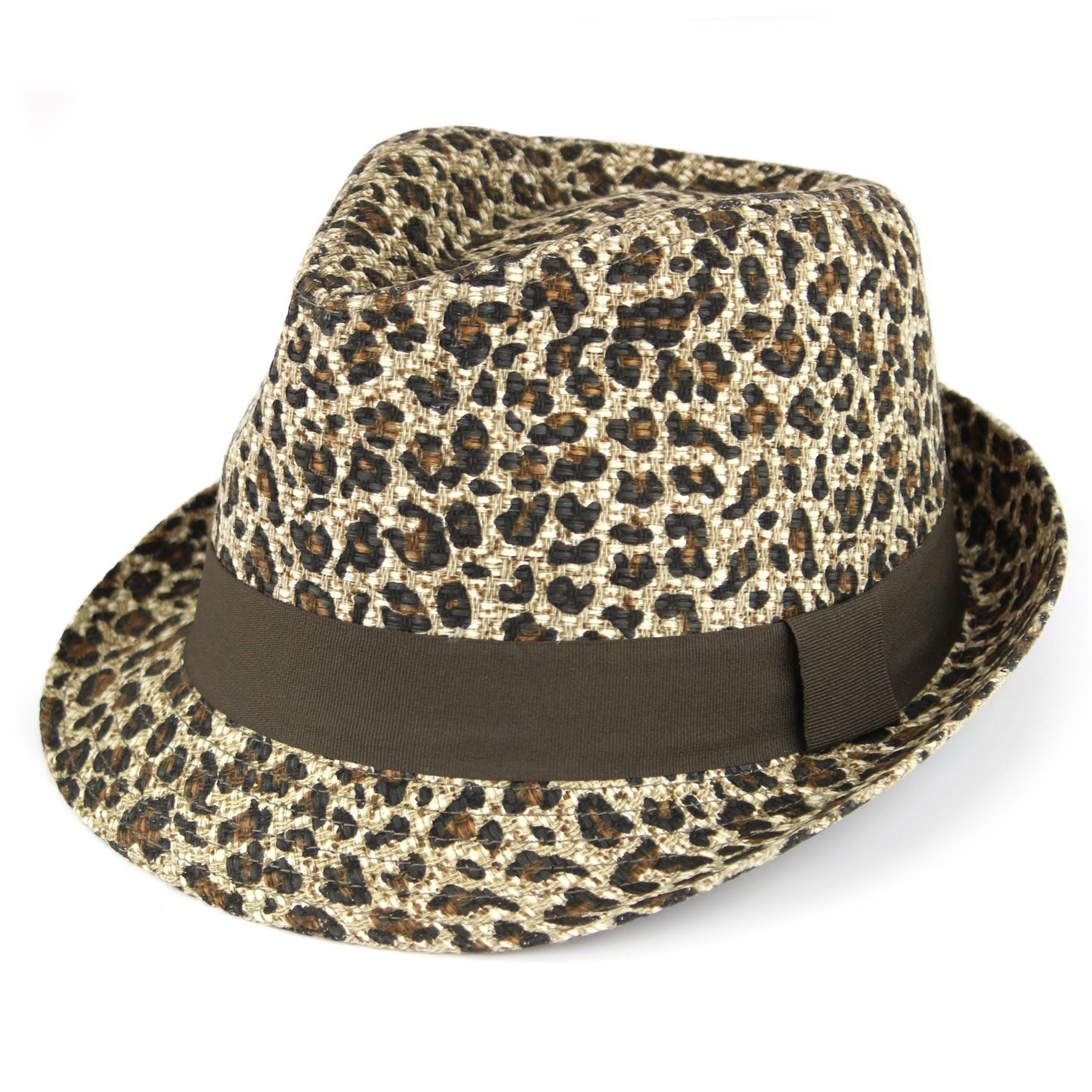 Leopard print straw paper trilby hat with a brown grosgrain band.