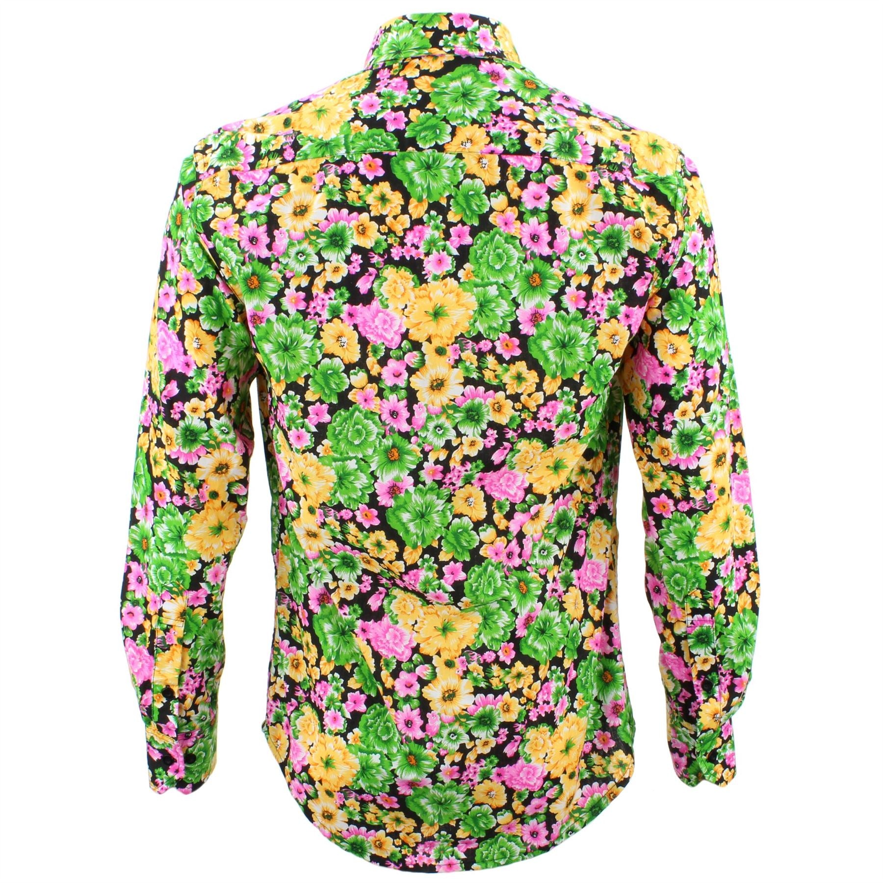 Print: Green, yellow and pink floral print on a black background.