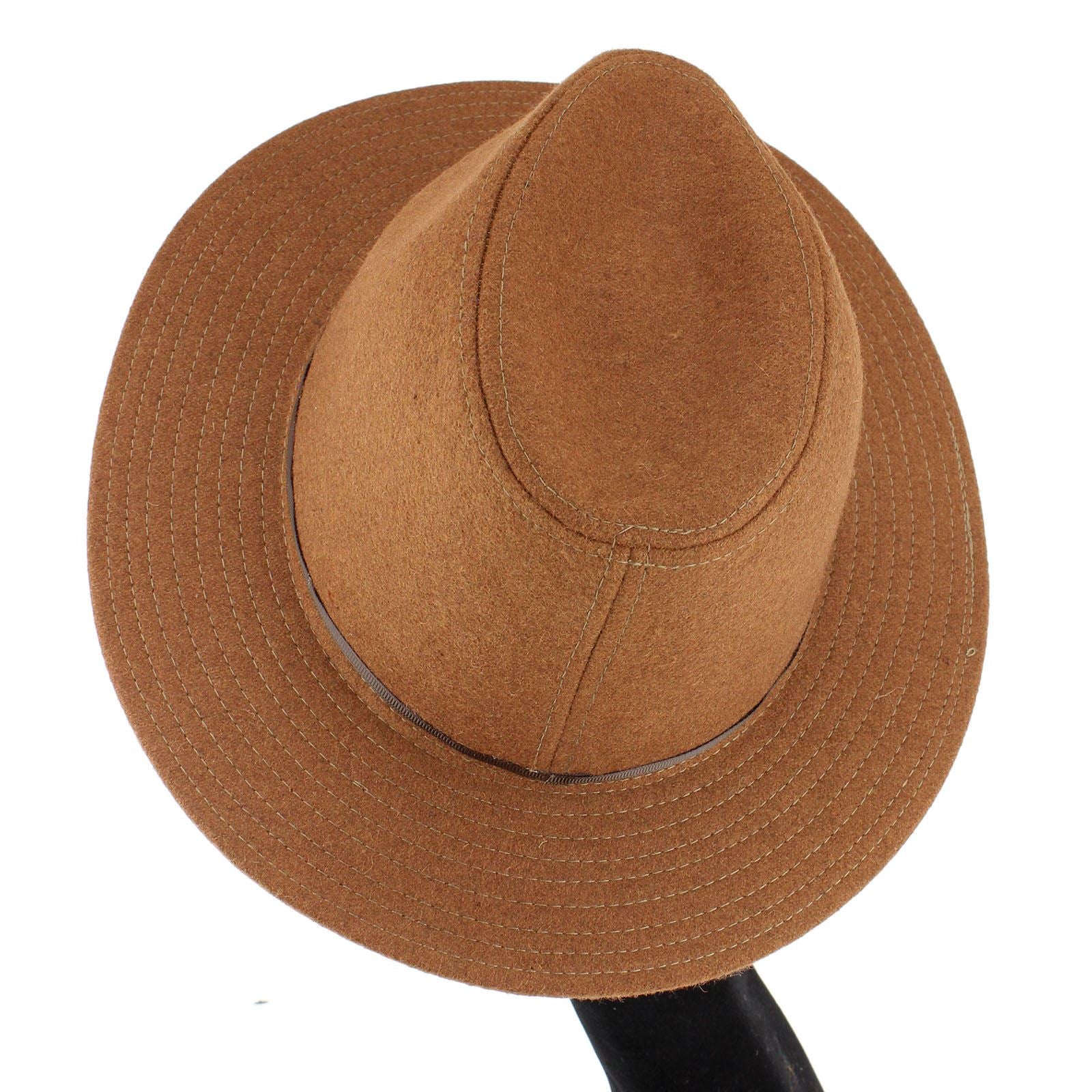 Wool felt fedora hat with a flat brim, dipped crown and a thin contrast band.