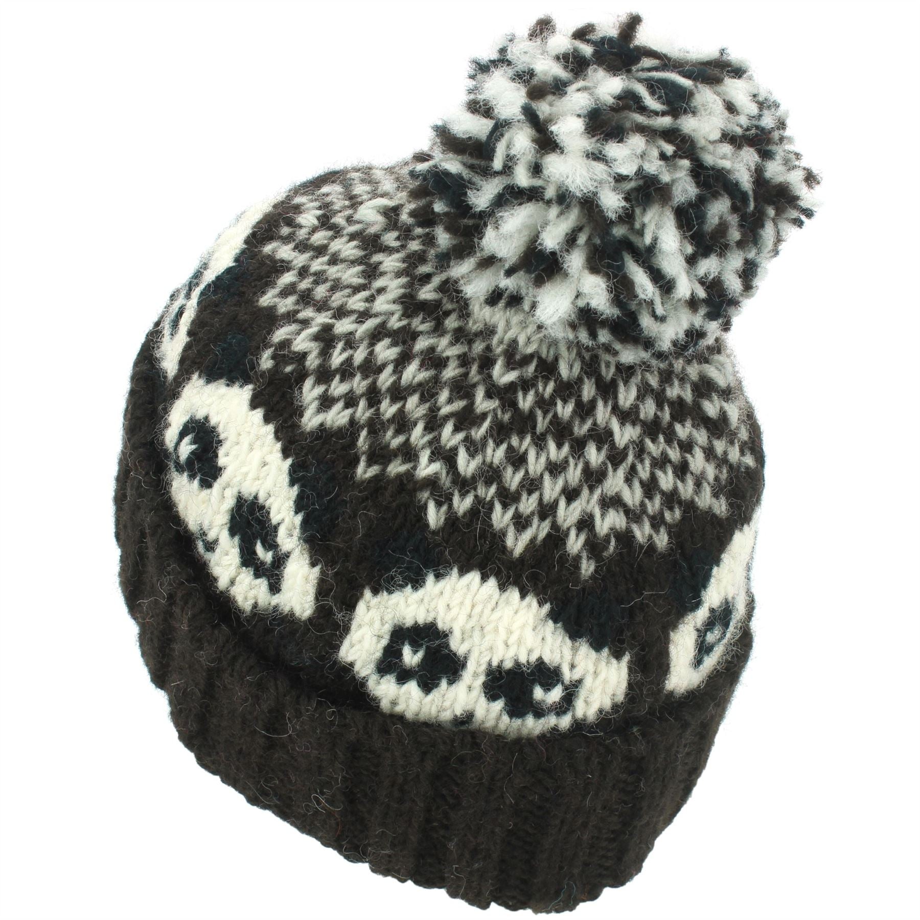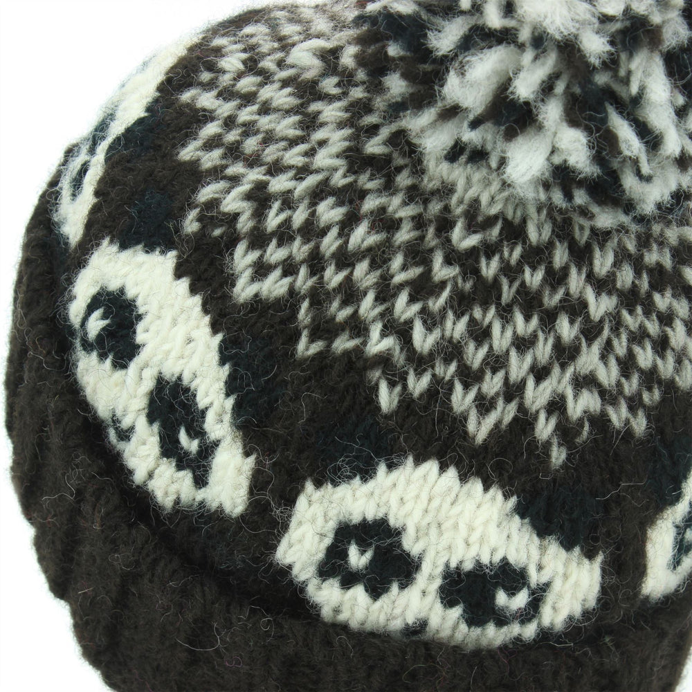 Wool Knit Bobble Beanie Hat - Panda - Brown Grey
