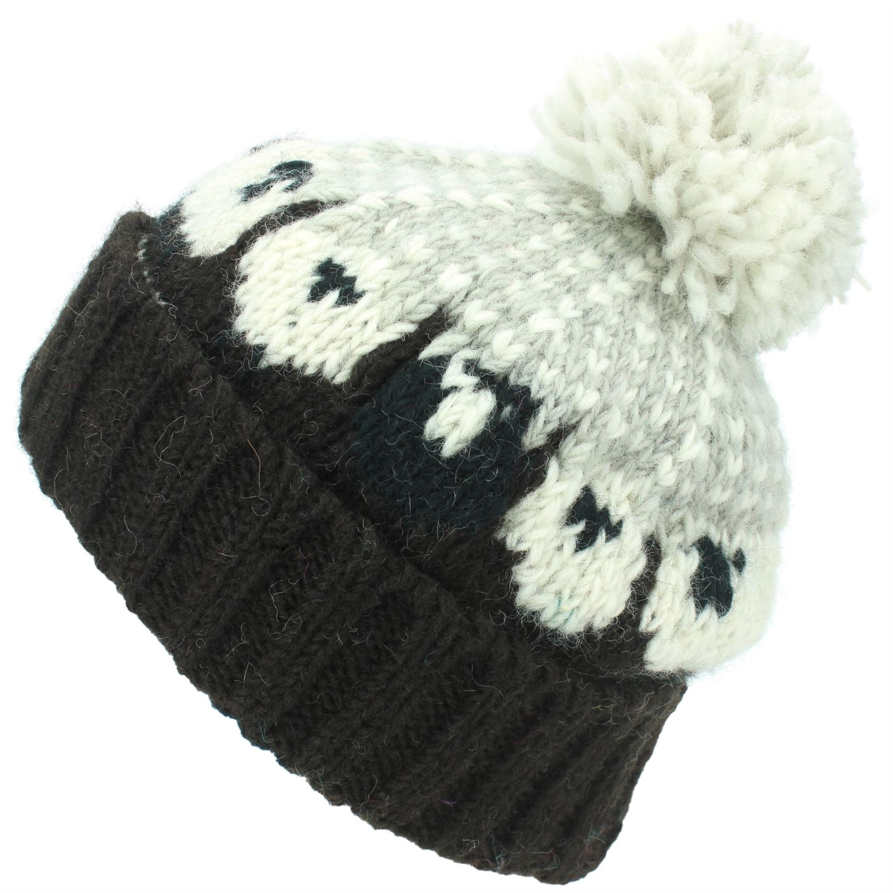 Wool Knit Bobble Beanie Hat - Sheep - Brown Grey